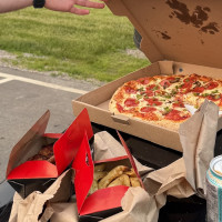 “ We had Xl pizza and chicken wings. Their wings were really soft to the touch and tasted good. Pizza they did half and half with different toppings. Less wait time. Took the pizza and ate in a park nearby and it was great . ”